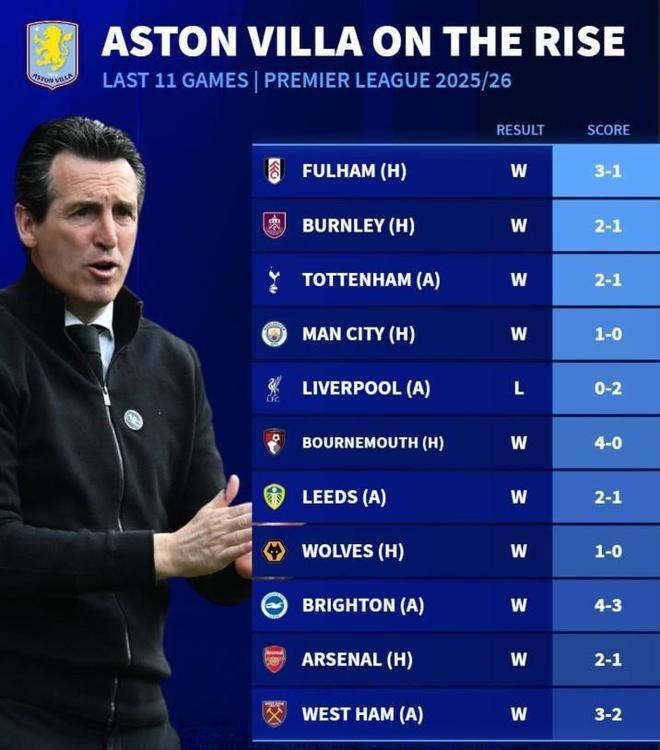 如今维拉与赛季之初,可以说是有着天壤之别。本赛季初,维拉那时正深陷5轮不胜(3平2负)的泥沼,一胜难求的维拉,当时在英超降级区里苦苦挣扎。如今,11轮联赛过后,维拉已经从降级区一路扶摇直上,来到了英超争冠区。为了所有这一切蜕变,都无法绕开一个人,那就是主帅埃梅里。这位曾被誉为“欧联之王”的战术大师,在维拉公园施展了神奇的魔法。