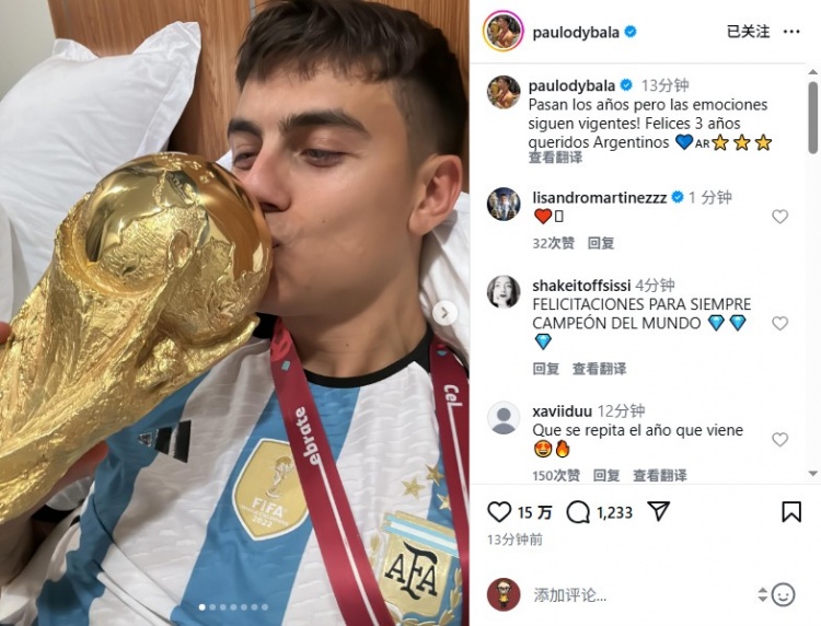 12月19日讯 迪巴拉今天更新Instagram,纪念阿根廷世界杯夺冠三周年。
